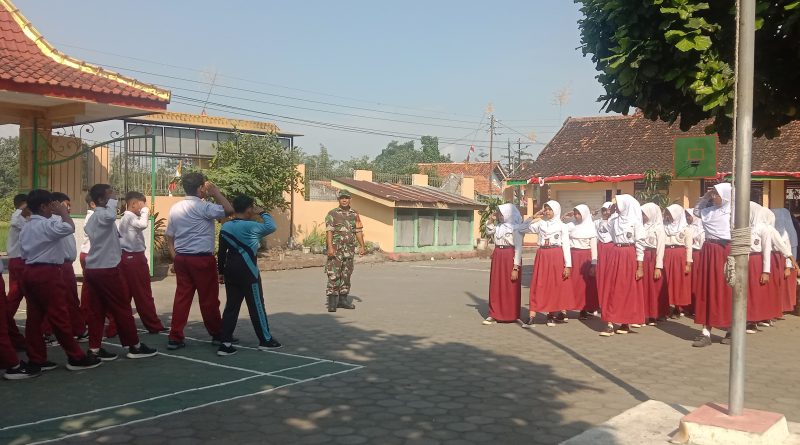 Sleman — Babinsa Koramil 08/Kalasan Kodim 0732/Sleman, Serda Hanry Handaka memberikan latihan Peraturan Baris Berbaris kepada 50 Siswa Siswi SD Negeri Bendungan Tirtomartani Kalasan Sleman,Senin (4/8/2025).