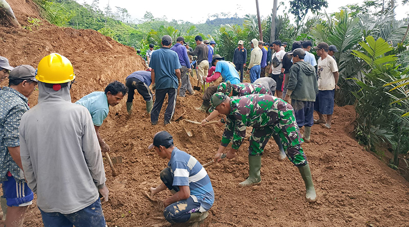Personel Koramil 02/Watumalang Kodim 0707/Wonosobo bahu-membahu membersihkan material tanah longsor yang menutup akses jalan Dusun Bungkusan menuju Siwadas, Desa Gumawang Kidul, Kecamatan Watumalang.