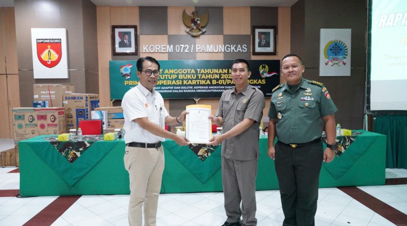 Yogyakarta. Korem 072/Pamungkas menyelenggarakan Rapat Anggota Tahunan (RAT) Primkop Kartika B-01 Pamungkas ke-57 Tutup Buku Tahun 2025 yang dibuka oleh Kasipers Kasrem 072/Pamungkas Kolonel Inf Handoko Yudho Wibowo, S.E., S.I.P., mewakili Danrem 072/Pamungkas bertempat di Aula Sugiyono Makorem 072/Pamungkas, Jalan Reksobayan No. 4 Kota Yogyakarta, Rabu (11/2/2026).