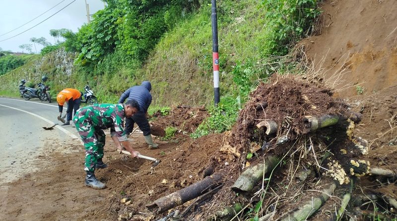 Wonosobo – Longsor menutup sebagian bahu jalan di Desa Kreo, Kecamatan Kejajar, Kabupaten Wonosobo, Jawa Tengah, Kamis (5/12/2025) dini hari. Babinsa Koramil 05/Kejajar Serka La Majid Buton langsung sigap membantu warga membersihkan material longsor agar akses jalan tetap bisa dilalui kendaraan.
