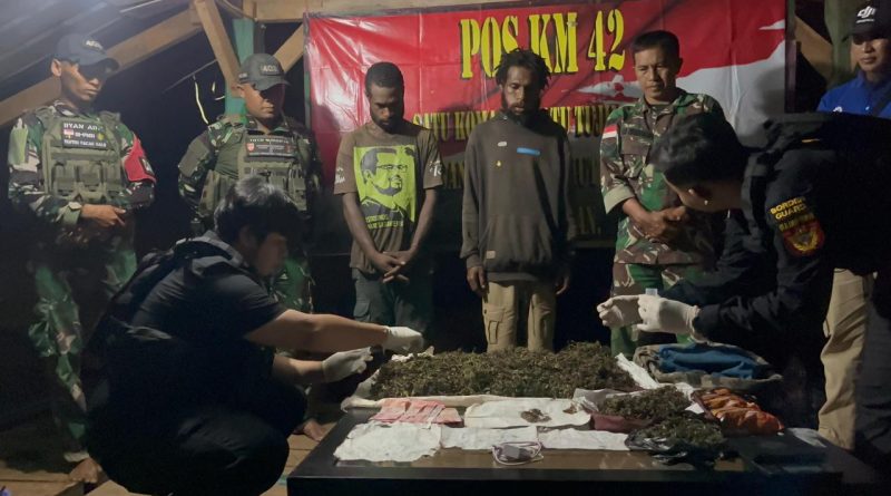 Distrik Sesnuk, Boven Digoel – Prajurit TNI Satgas Pamtas RI-PNG Statis Yonif 403/WP Pos KM 42 berhasil menggagalkan upaya penyelundupan narkotika jenis ganja berupa 4 paket ganja kering seberat 2 Kilogram dari 2 orang warga berinisial CY (27) dan AS (24), di Kp. Kanggup, Distrik Sesnuk, Kabupaten Boven Digoel, Sabtu (28/3/2026).