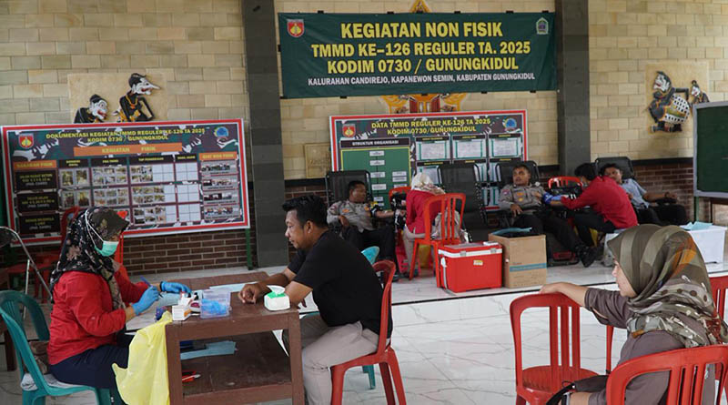 GUNUNGKIDUL – Program TNI Manunggal Membangun Desa (TMMD) ke-126 Reguler Kodim 0730/Gunungkidul tidak hanya berfokus pada pembangunan fisik infrastruktur, tetapi juga memperkuat kegiatan non-fisik yang menyentuh langsung aspek sosial dan kemanusiaan. Salah satu kegiatan non-fisik yang sukses di selenggarakan adalah Aksi Donor Darah di Balai Kalurahan Candirejo, Kapanewon Semin, Kabupaten Gunungkidul. Rabu (29/10/2025).