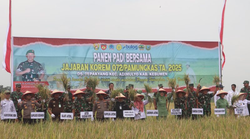 KEBUMEN. Komandan Korem 072/Pamungkas Brigjen TNI Bambang Sujarwo, S.H., M.Sos., M.M. mendampingi Pangdam IV/Diponegoro Mayjen TNI Achiruddin, S.E., M.Han. melaksanakan Panen Raya Padi di Desa Tepakyang, Kecamatan Adimulyo, Kabupaten Kebumen, Rabu (13/8/2025).
